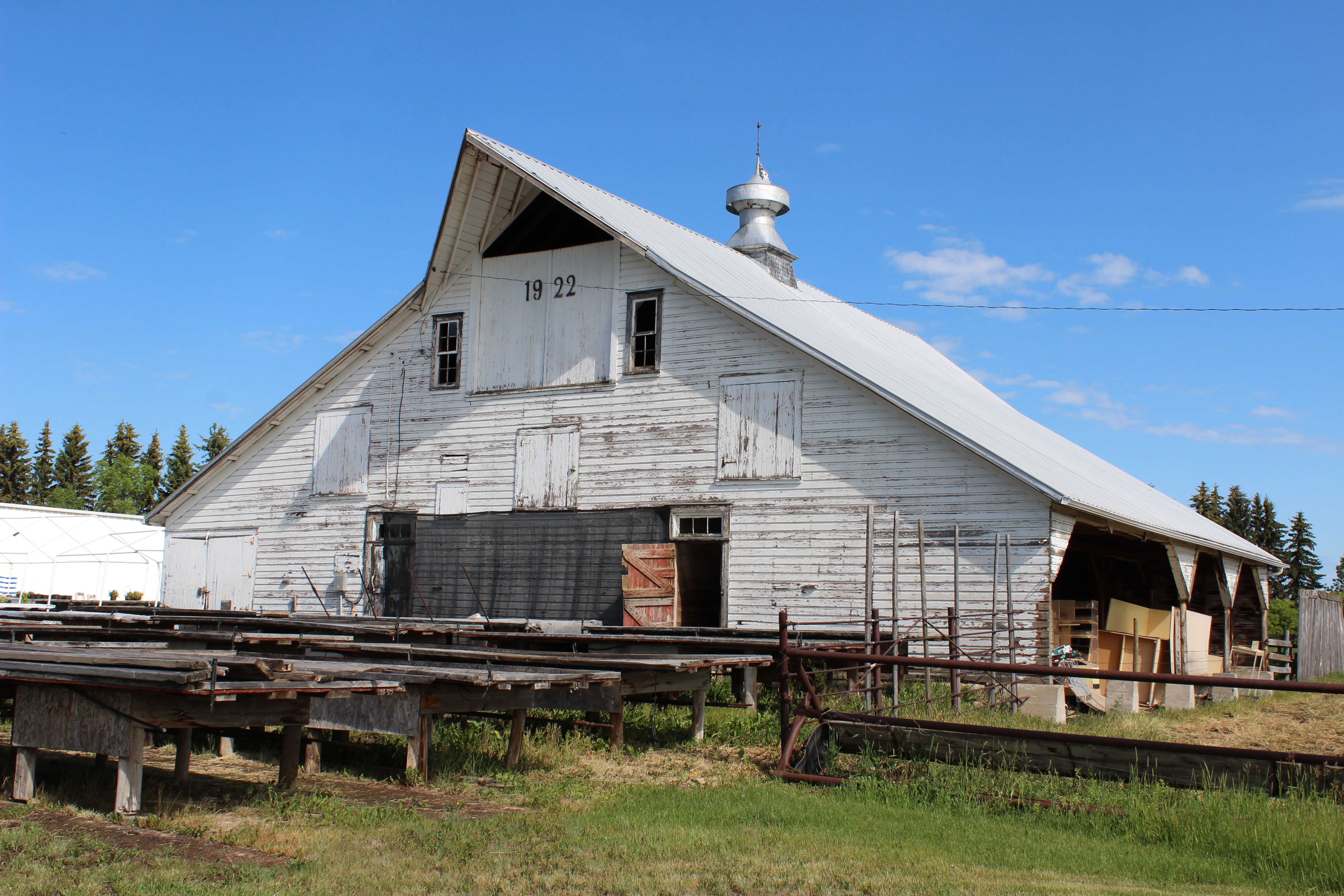 IMG_4797 Previous Next Published June 27, 2016 at 5184 × 3456 in Feddema This frame shows the south and east faces of the barn. This barn has a bonnet style roof which is created by the two shed like structures. The two “sheds” are essential for the barns structural integrity and are part of the original construction.