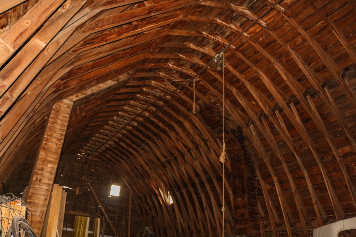 This frame was taken from the South whilst looking North and was taken from the top of the staircase. The hay track is visible in the peak of the roof. The ventilator chutes do not have the ability to circulate air since they are not connected to a metal ventilator or a cupola outside.