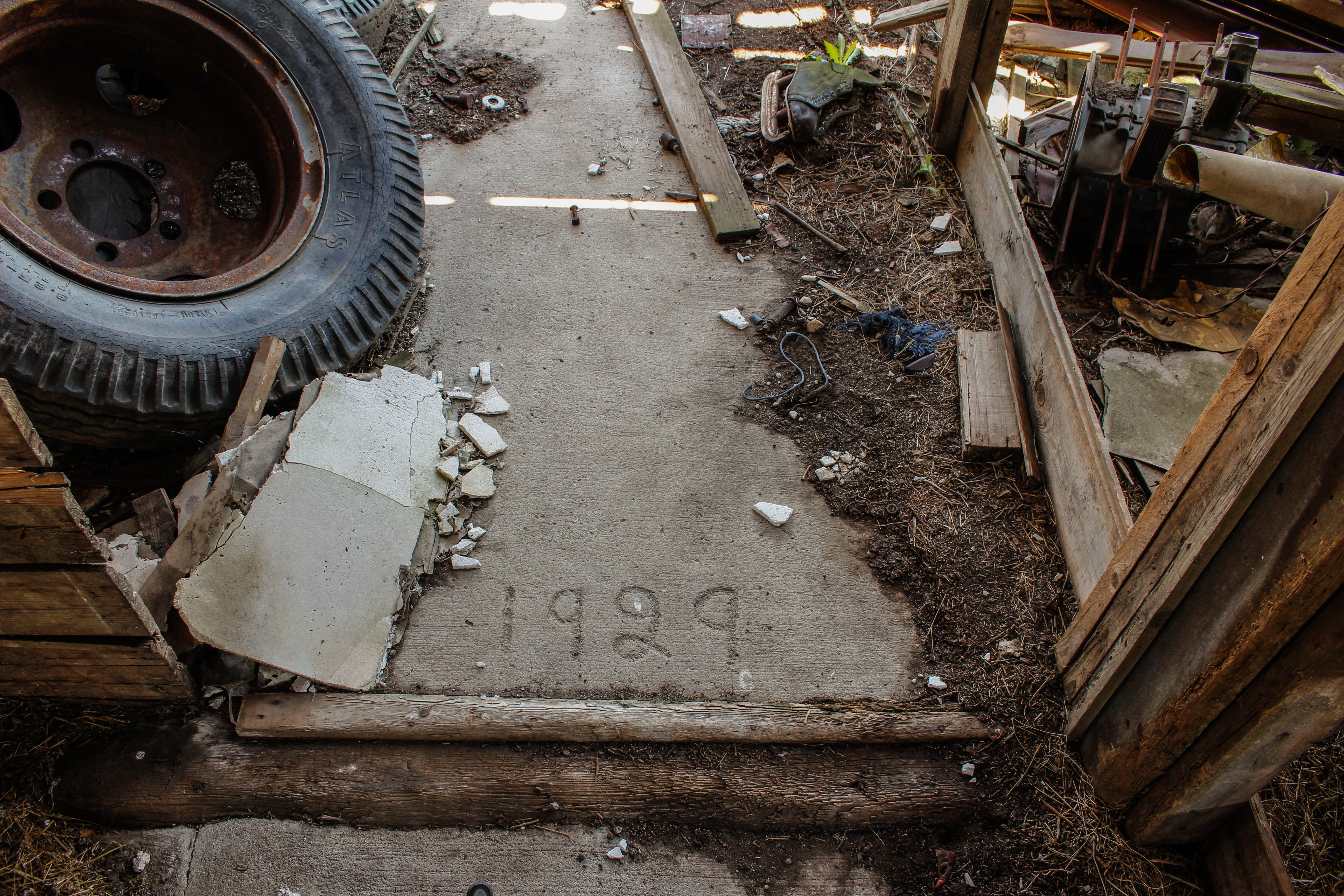 _MG_8818 Previous Next Published July 17, 2017 at 5184 × 3456 in Lewis This frame shows the cement floor inside the shed addition. The year “1929” is written into the cement on the western side of the floor of the addition.