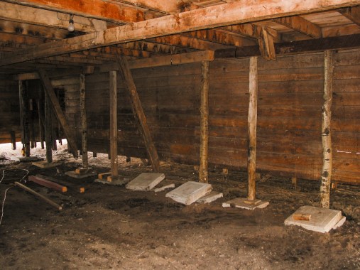 This frame shows the barn in 2002. The sills of the barn rotted out and had to be replaced. Don Janzen lifted the barn and repaired its foundation. The corner in the background is the south-eastern corner of the main barn. The main wall in this picture was originally the outside of the shed on the barn.
