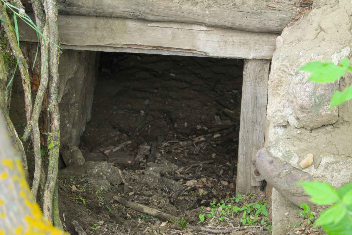 The cellar was hand-dug and used to keep preserves cold all year. The roof over the entrance to the cellar is made of large timbers laid parallel to the door in a line. Dirt was then shaped to cover the logs. This stabilized the entrance and stopped cave-ins.