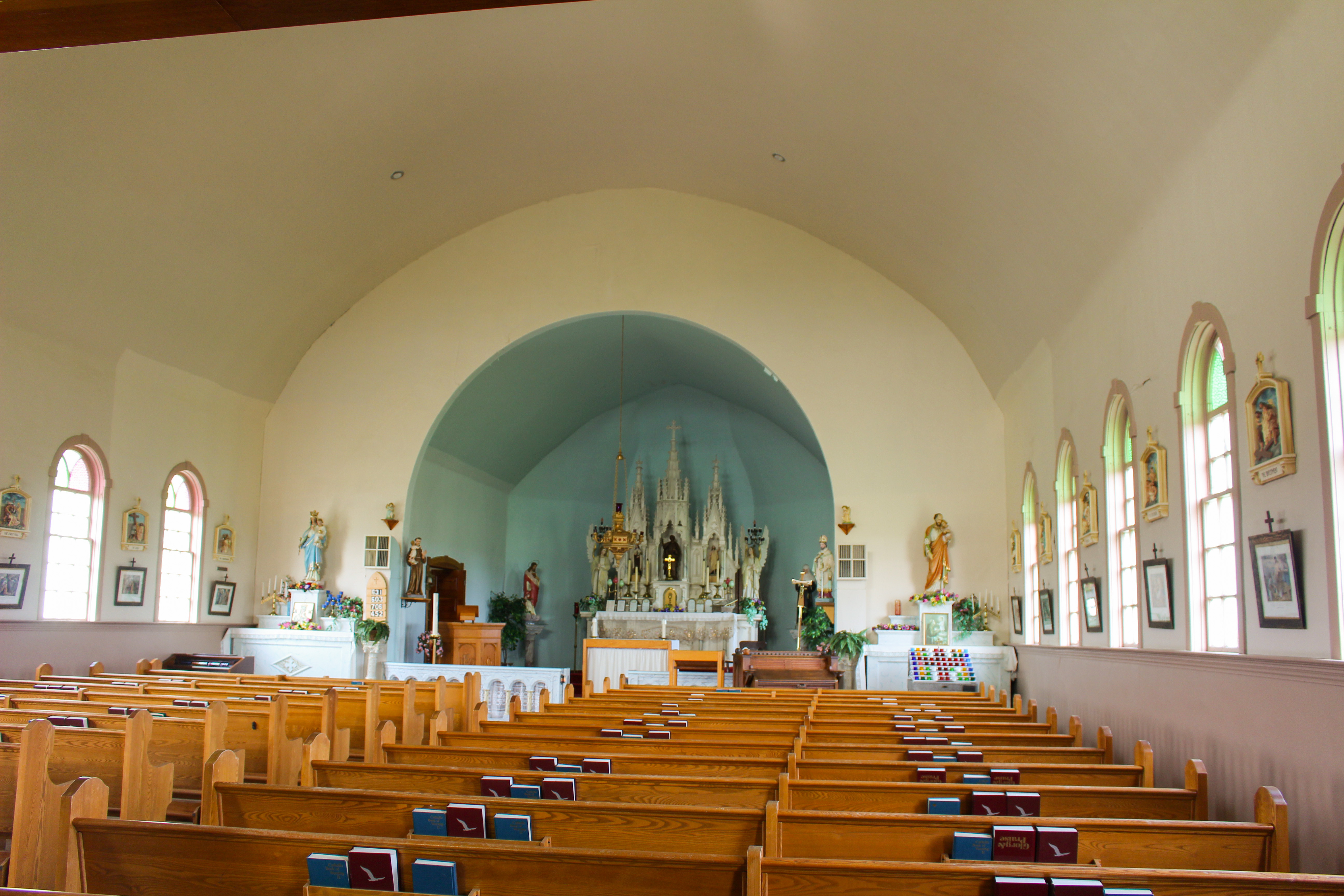 IMG_7254 Previous Next Published August 8, 2018 at 5184 × 3456 in St. Peter’s Roman Catholic Church This frame shows the pews inside the nave of the church. Note the apse in the western face of the church (paint blue in this frame). In this church, the chancel (or part of the church near the altar) is carpeted.