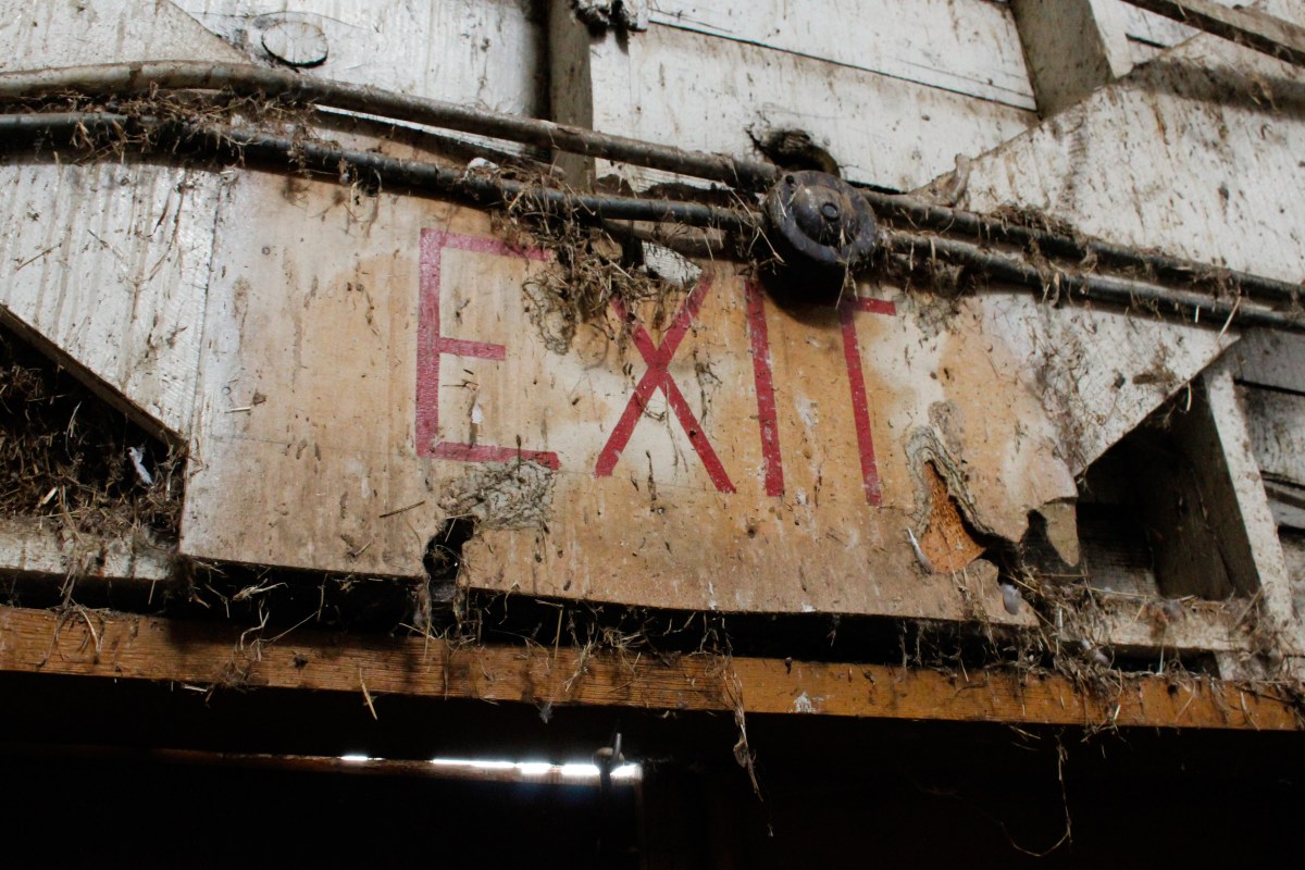 IMG_2578 Previous Next Published August 29, 2018 at 4554 × 3038 in Coldstream Barn/George This frame is a closeup of the “EXIT” sign above the main entrance.