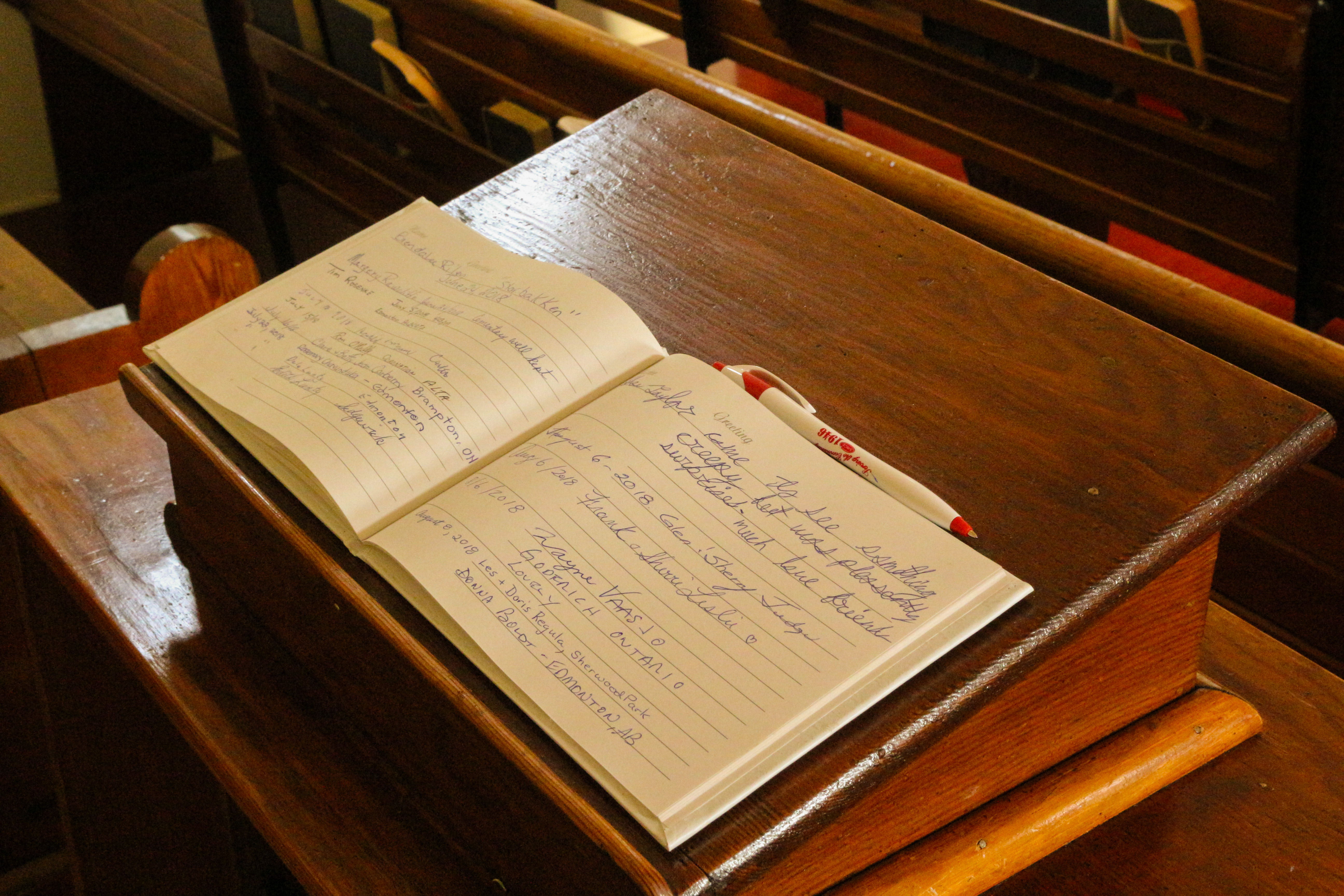 IMG_0158 Previous Next Published August 28, 2018 at 5184 × 3456 in Merna United Church This frame shows the guestbook in the southern end of the nave.