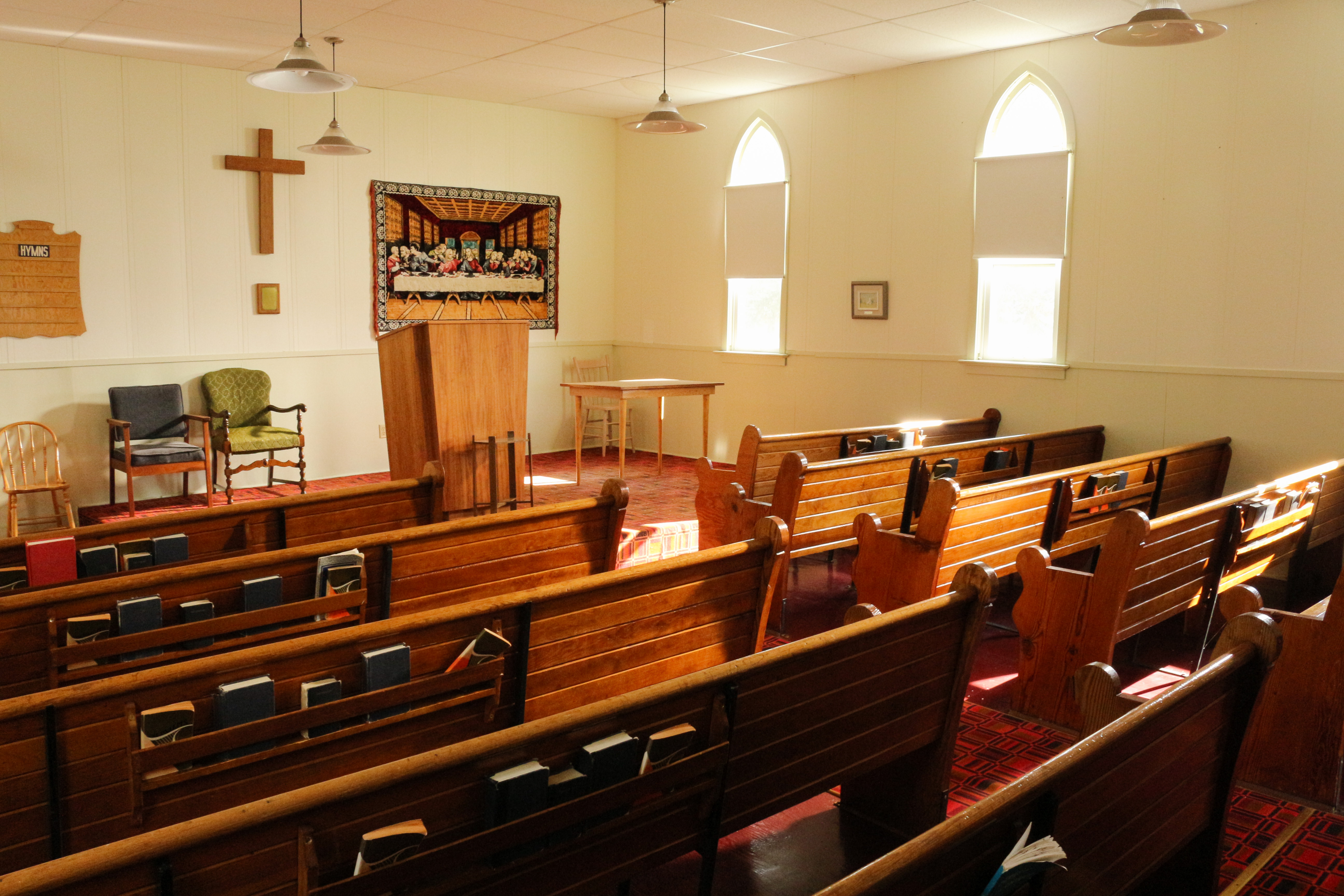 IMG_0165 Previous Next Published August 28, 2018 at 5184 × 3456 in Merna United Church This frame shows more of the eastern side of the church and focuses more on the wooden pews. These pews are the original pews built by George Jackman.
